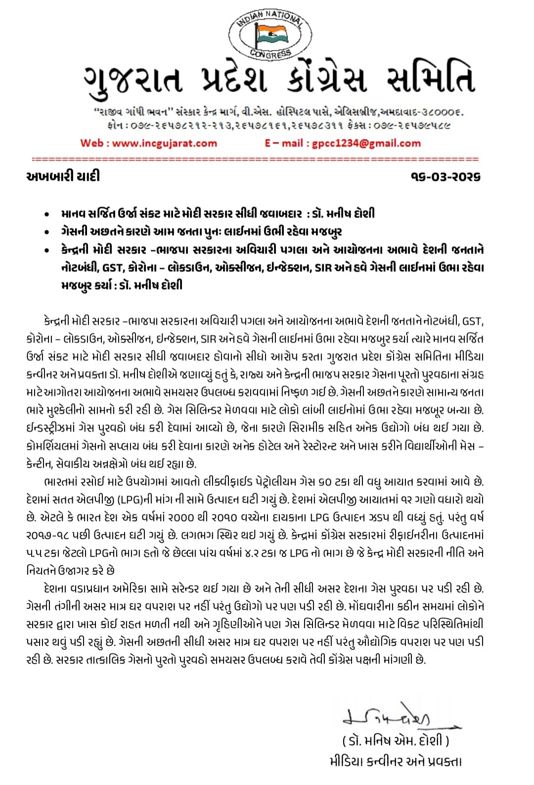 માનવ સર્જિત ઉર્જા સંકટ માટે મોદી સરકાર સીધી જવાબદાર : ડૉ. મનીષ દોશી : 16-03-2026